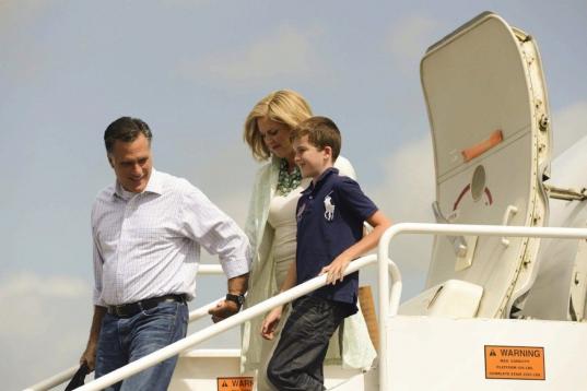 El gobernador de Massachussets y candidato a la presidencia de Estados Unidos, Mitt Romney, su esposa, Anne Romney, y uno de sus nietos descienden del avión a su llegada a Tampa.