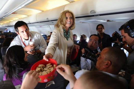 Ann Romney, esposa del candidato republicano en las elecciones presidenciales, Mitt Romney, ofrece galletas a los periodistas mientras responde a sus preguntas en el avión que la llevó junto a su marido a la convención republicana de Tampa.
