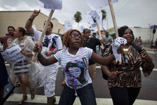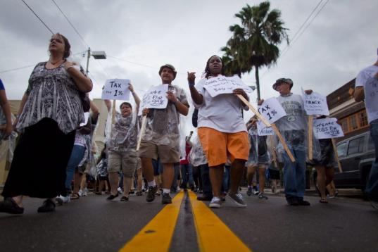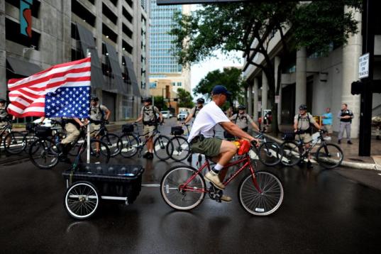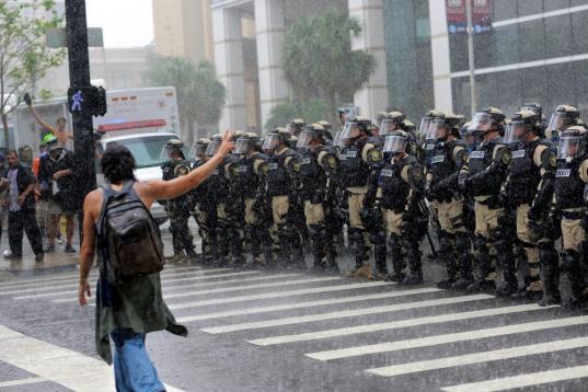 Manifestantes protestan contra la Convención Nacional Republicana en Ybor City, Florida (EE.UU.).