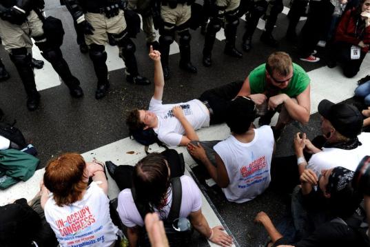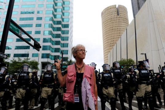 Manifestantes bloquean una calle durante una protesta no autorizada cerca de la Convención Nacional Republicana