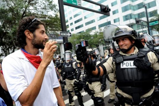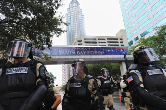 Autoridades vigilan a los manifestantes que bloquean una vía cerca al lugar en donde se realiza la Convención Nacional Republicana en Tampa
