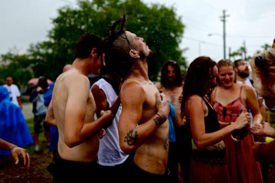 Manifestantes permanecen bajo un aguacero producto de la tormenta Isaac cerca de la Convención Nacional Republicana