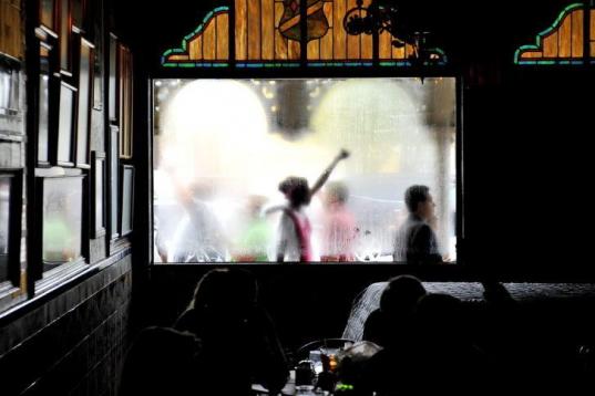 Manifestantes pasan frente a una ventana de un restaurante donde un grupo de líderes republicanos está reunido