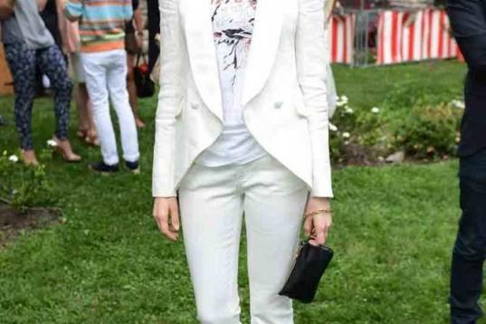 La modelo Elisa Sednaoui, combina el traje con el estilo pijama que tanto se lleva esta temporada.