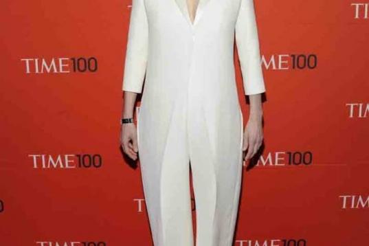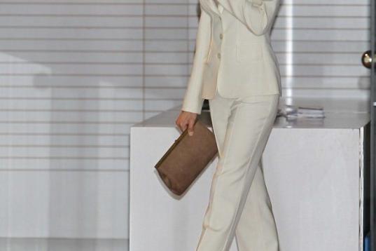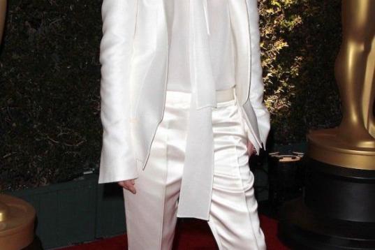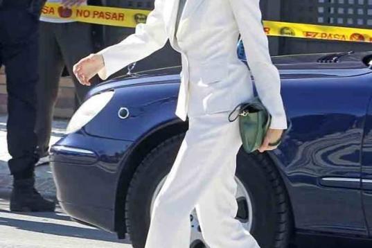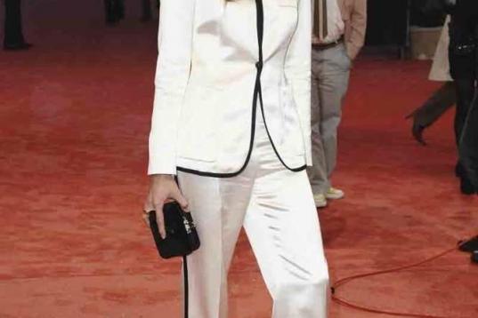 Tilda Swinton se lleva a su terreno el traje pantalón blanco y está elegantísima.