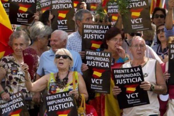 Los asistentes han coreado consignas como "Rajoy es traicionero como Zapatero", "Contra ETA, cadena perpetua", "Rajoy, veleta, ¿qué debes a la ETA?" o "No queréis a las víctimas del terrorismo, no queréis a España".
