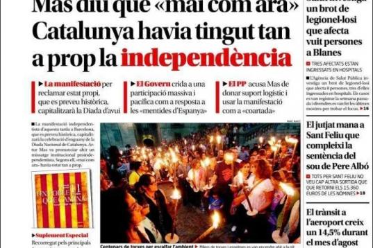 "No todos los que acudan serán independentistas, pero el lema y su pretensión no deja lugar a equívocos", afirma el periodista y filósofo Josep Ramoneda. "La trascendencia de esta manifestación puede tener una repercusión política inmediata. Si tiene éxito, y es tan multitudinaria como se pronostica, no tardará mucho tiempo en producirse un adelanto de las elecciones autonómicas", aventura Juliana. En esa cita electoral se podría dar una mayoría parlamentaria más soberanista, según pronostica el último sondeo del Centro de Estudios de Opinión de la Generalitat, en el que, por primera vez, se registra una mayoría de catalanes (51,1%) que votaría a favor de la independencia.