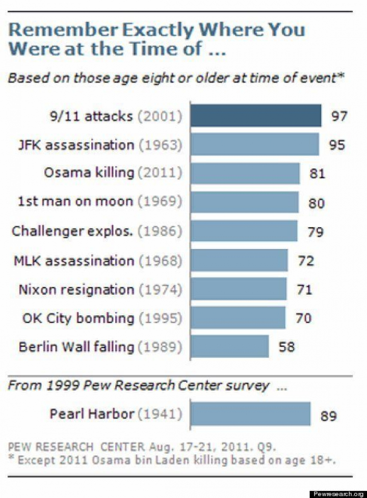 Del estudio se desvela que el impacto del 11-S es mayor que ningún otro hecho histórico para los estadounidenses. El 97% de los adultos se acuerda de dónde estaba, un porcentaje mayor que los que recuerdan dónde se hallaban el día en el que Obama anunció el asesinato de Osama Bin Laden, un 81%, ocurrido en mayo de 2011.