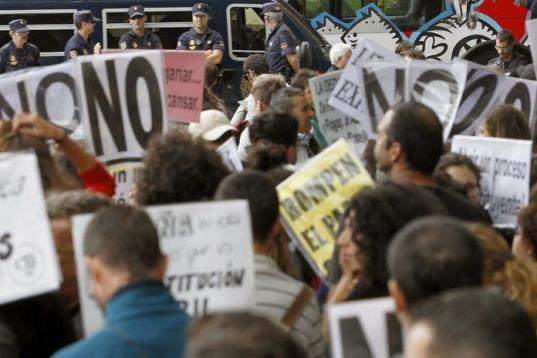 Un grupo de policías vigila a los manifestantes ante la mirada de los turistas.