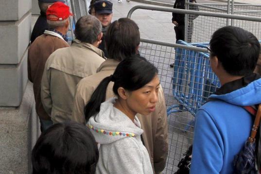 Un grupo de representantes de la coordinadora 25-S, durante la rueda de prensa que han ofrecido esta mañana en las inmediaciones del Congreso de los Diputados