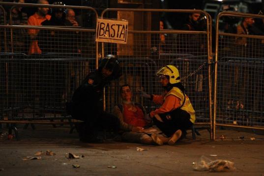 Una manifestante es auxiliada por el SAMUR