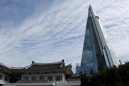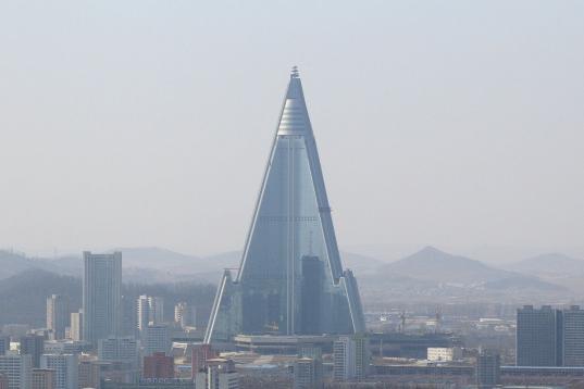 Sin embargo, la construcción de la torre de 330 metros de altura se detuvo en 1990 por falta de fondos para pagar su construcción. En 2008 se reanudaron los trabajos y desde entonces los ciudadanos de Pyongyang han visto la mole piramidal cambiar lentamente.