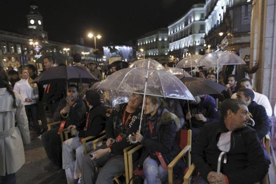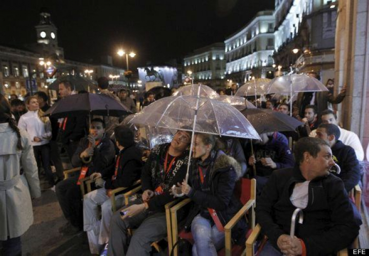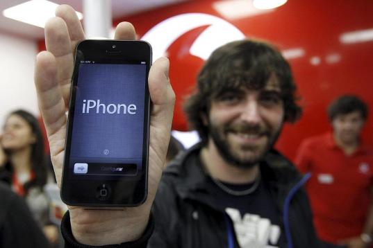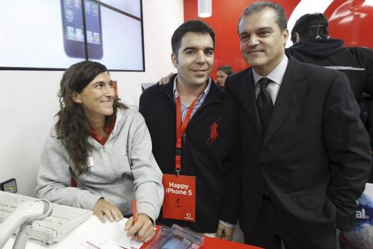 Más de 300 personas hacían cola frente a las tiendas que en la madrileña Puerta del Sol tienen las compañías Orange y Vodafone, para comprar, después de que el conocido presentador Ramón García acabará la cuenta atrás a las 00.00 horas, las primeras unidades en España del nuevo teléfono inteligente de Apple, el iPhone 5.