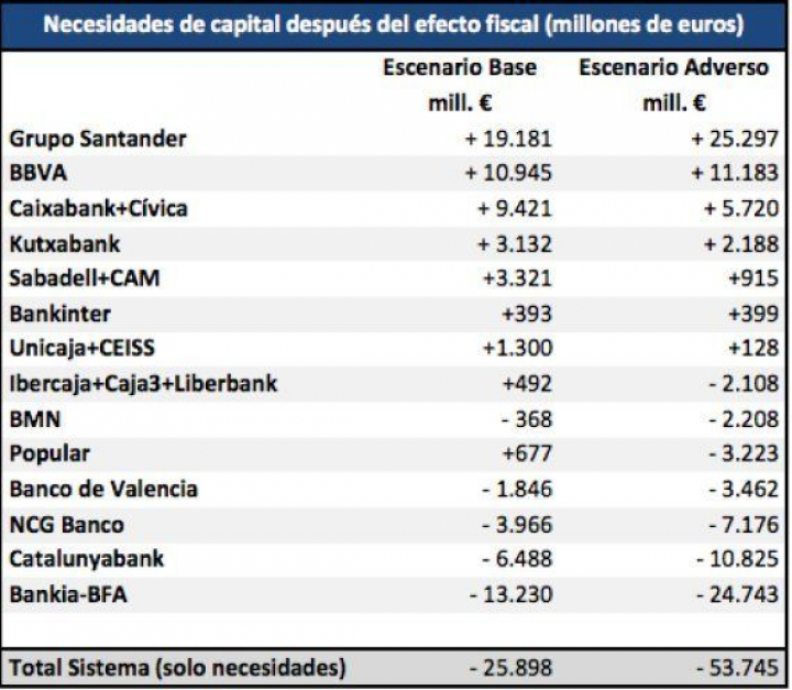 Santander, BBVA, Caixabank, Kutxabank, la fusión de Sabadell y CAM, Bankinter y Unicaja no necesitan capital adicional. Son el 62% del sector financiero español. En concreto, en el peor de los casos el Santander dispone de un colchón de 25.297 millones de euros, el BBVA, de 11.183 millones, Caixabank-Banca Cívica, de 5.720 millones, Kutxabank, de 2.188 millones, Sabadell-CAM, de 915 millones, Bankinter, de 399 millones, y Unicaja-CEISS, de 128 millones.