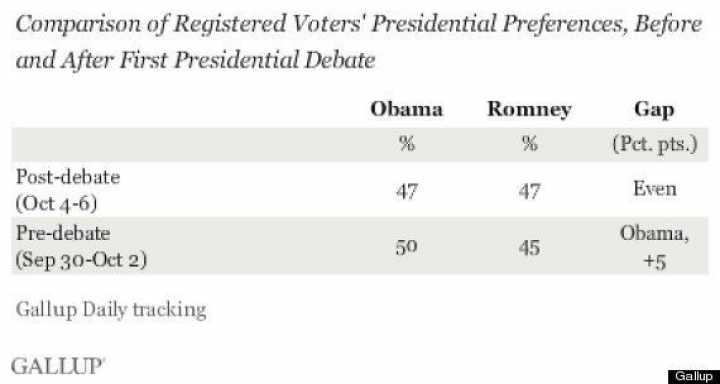 La actitud fría de Obama no gustó a los votantes, cuya intención de voto ha reducido su ventaja de cinco puntos antes del debate (del 30 al 2 de octubre) a nada. Ahora ambos contendientes están empatados a 47%, según los datos recogidos del 4 al 6 de octubre. De hecho, Obama llegó a tener una ventaja de seis puntos.