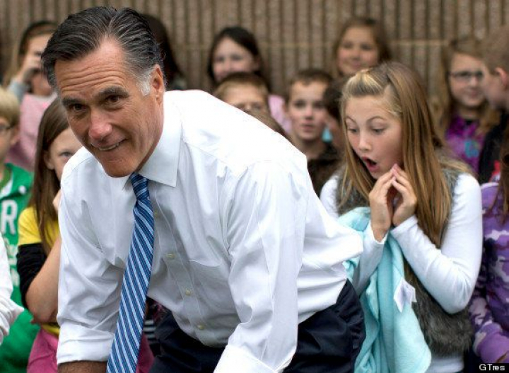 Una foto de Associated Press de una niña mirando con cara de sorpresa por detrás de Mitt Romney agachado, en la que parece que la menor está fijándose en el trasero del candidato republicano, ha causado polémica en Estados Unidos.