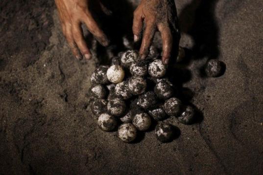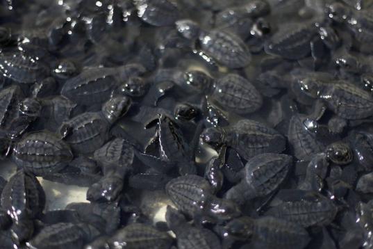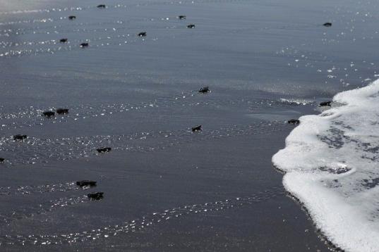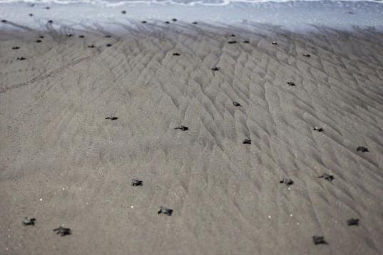 Muchas organizaciones de conservación de la naturaleza realizan liberaciones de tortugas en playas, como esta de El Salvador. Estas fotos de tortugas golfinas entrando en el mar representan el último paso de la cadena de cuidados de los biólogos de la Fundación Zoológica de El Salvador. Pescadores locales extraen huevos de los nidos y los venden a esta fundación (una iniciativa que trata así de evitar los robos). Allí se espera a que salgan del cascarón y después se les devuelve al océano.