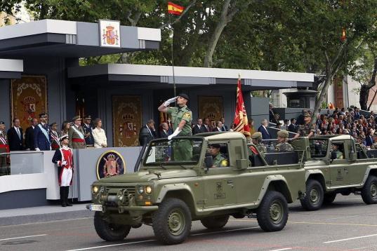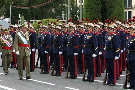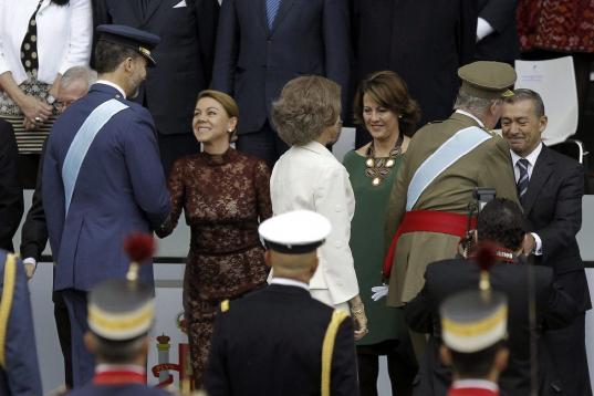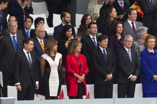 Doña Elena ha llegado a la plaza de Neptuno de Madrid, lugar en el que han ubicado las tribunas de autoridades para seguir el desfile, poco antes de que lo hicieran don Juan Carlos y doña Sofía y los príncipes de Asturias. Posteriormente, a diferencia de años anteriores, no se ha dirigido a la tribuna principal en la que se han situado los reyes y los príncipes, sino que lo ha hecho a la destinada a otras autoridades como los dirigentes de los partidos políticos.