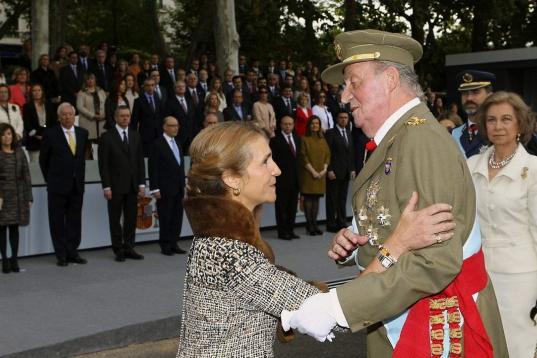 La infanta Elena no ha estado presente durante el desfile militar con motivo de la Fiesta Nacional en la tribuna desde la que lo siguieron los reyes y los príncipes, ni en la línea de saludo en la recepción posterior que ofrece don Juan Carlos en el Palacio Real.