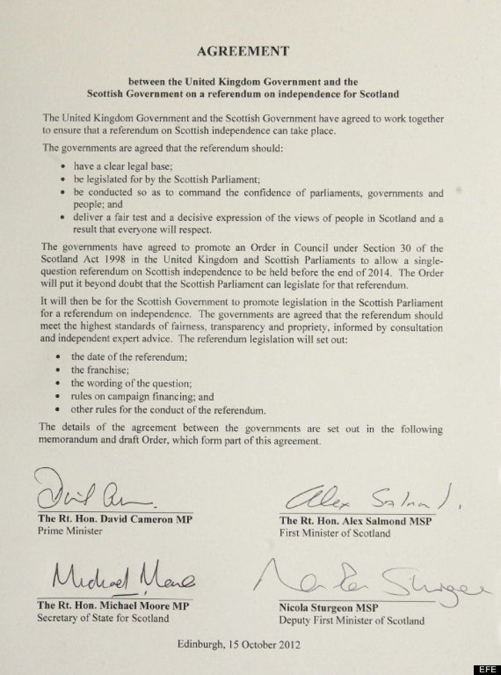 El primer ministro británico, David Cameron, y el ministro principal escocés, Alex Salmond, han firmado este lunes el acuerdo para la celebración, en 2014, del referéndum sobre la independencia de Escocia.