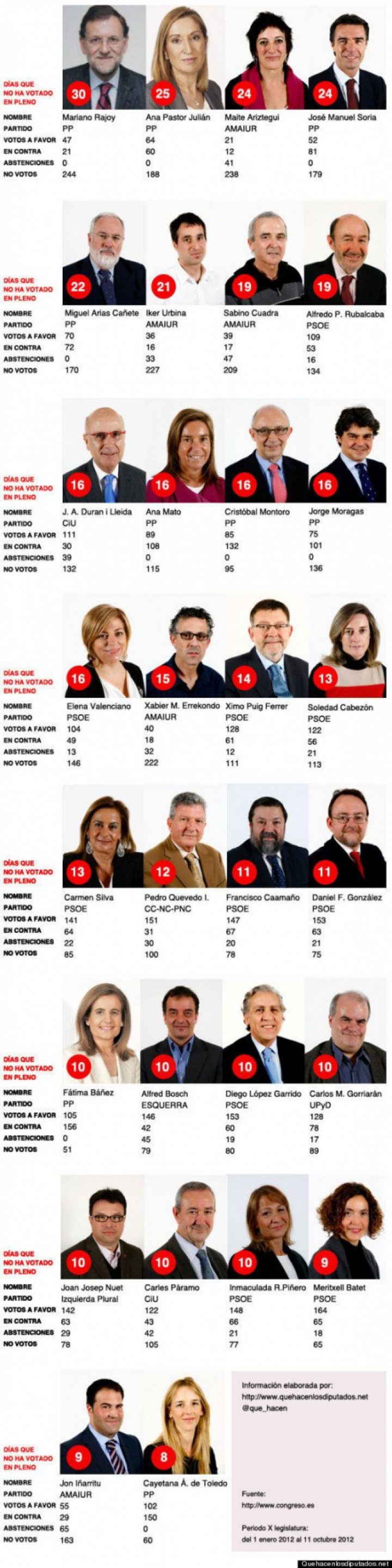 El presidente del Gobierno, Mariano Rajoy, es también presidente de los ausentes en el Congreso a la hora de votar. La web Qué Hacen Los Diputados, a través de las estadísticas que desde junio publica la Cámara baja en su web, ha realizado una clasificación de los diputados que menos han votado en lo que llevamos de legislatura (del 11 de enero y al 11 de octubre de 2012).