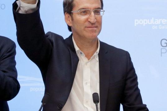 El presidente de la Xunta y candidato a la reelección por el PPdeG, Alberto Núñez Feijóo, saluda a la prensa desde el coche en el que llega a la sede del partido, en Santiago de Compostela, para seguir el recuento de los resultados de los co...