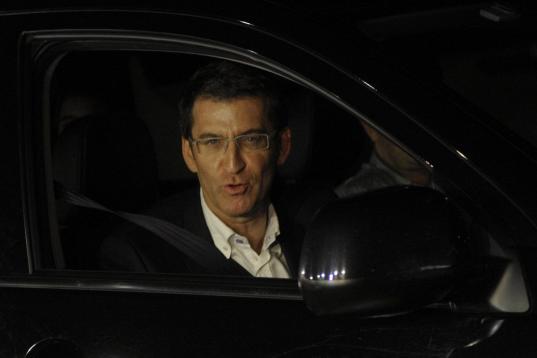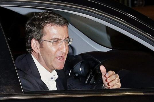 Alberto Núñez Feijóo saluda a la prensa desde el coche en el que llega a la sede del partido, en Santiago de Compostela, para seguir el recuento de los resultados.