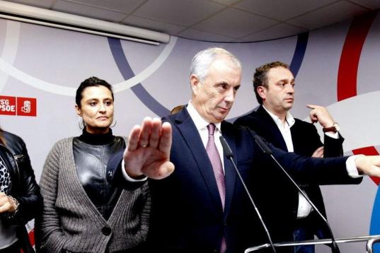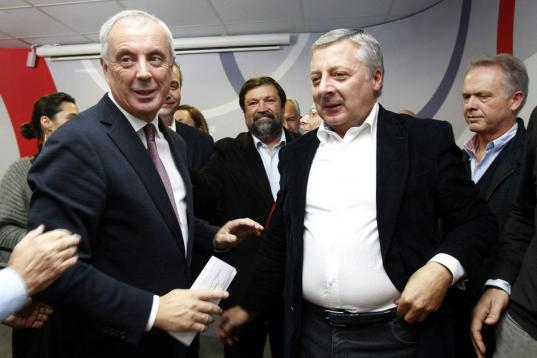 El candidato socialista a la Presidencia de la Xunta Pachi Vázquez, acompañado por el exministro de Fomento José Blanco y el cabeza de lista por A Coruña Francisco Caamaño, en la comparecencia tras conocer los resultados de las elecciones g...