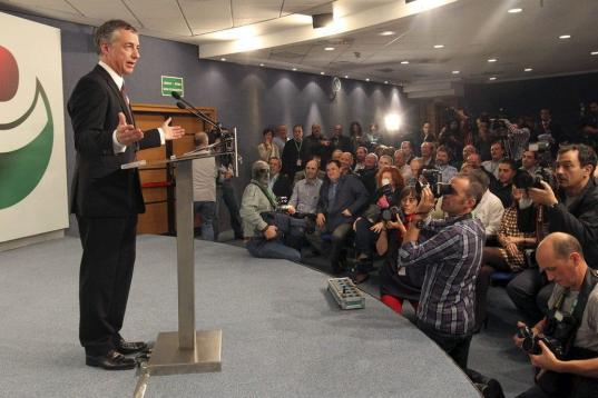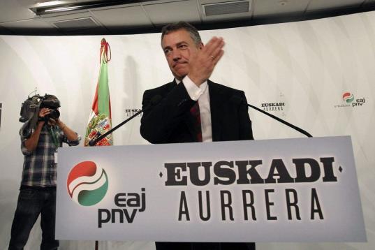 El candidato a lehendakari por el PNV, Iñigo Urkullu, durante su comparecencia en Bilbao para valorar el recuento de votos.