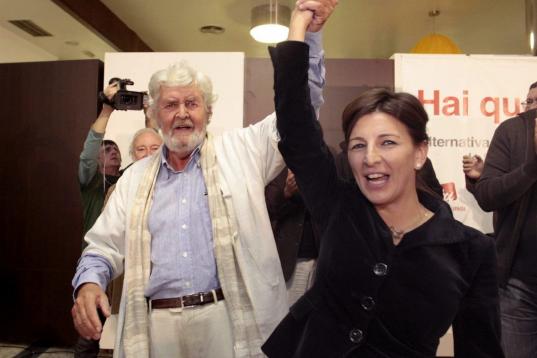 El candidato de Alternativa Galega de Esquerda (AGE) a la Presidencia de la Xunta, Xosé Manuel Beiras, acompañado por la número dos de la coalición, Yolanda Díaz, tras conocer los resultados de las elecciones gallegas.