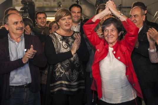 La candidata a Lehendakari por Bildu, Laura Mintegi (d), celebra los resultados obtenidos por su formación en las elecciones al Parlamento Vasco