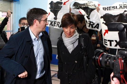 Un grupo de personas ha recibido con carteles en apoyo de los presos de ETA al lehendakari, Patxi López, y su esposa, Begoña Gil, en el colegio electoral de Bilbao donde han depositado su voto.