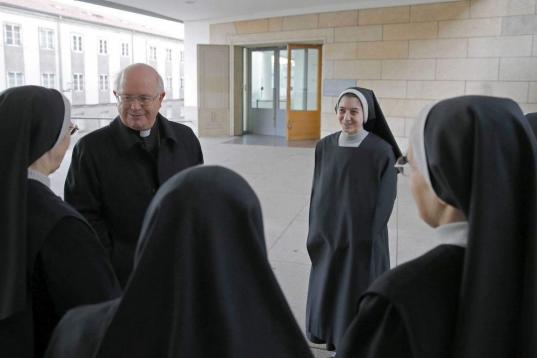 El arzobispo de Santiago, Julián Barrio, habla con grupo de religiosas antes de votar a primera hora para las elecciones gallegas.
