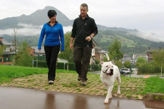 El candidato a lehendakari por el PNV, Iñigo Urkullu, pasea con su esposa Lucía y su perro en la jornada de reflexión.