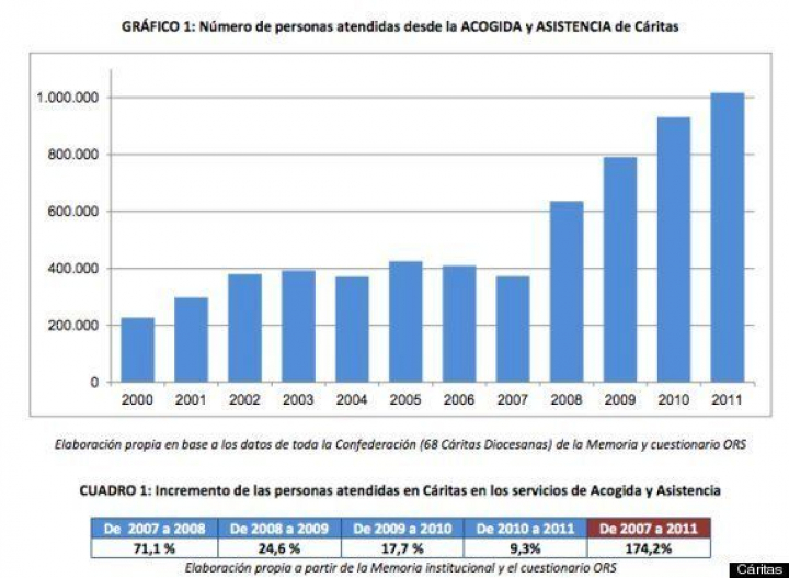 De hecho, esta organización ha visto cómo se ha incrementado el número de gente que ha acudido a recibir asistencia, pasando de 370.251 en 2007 a 1.015.276 en 2011, lo que supone un aumento del 174,2%. Según Cáritas, "desde que se inició la crisis, se ha multiplicado por 2,7 el número de personas atendidas".