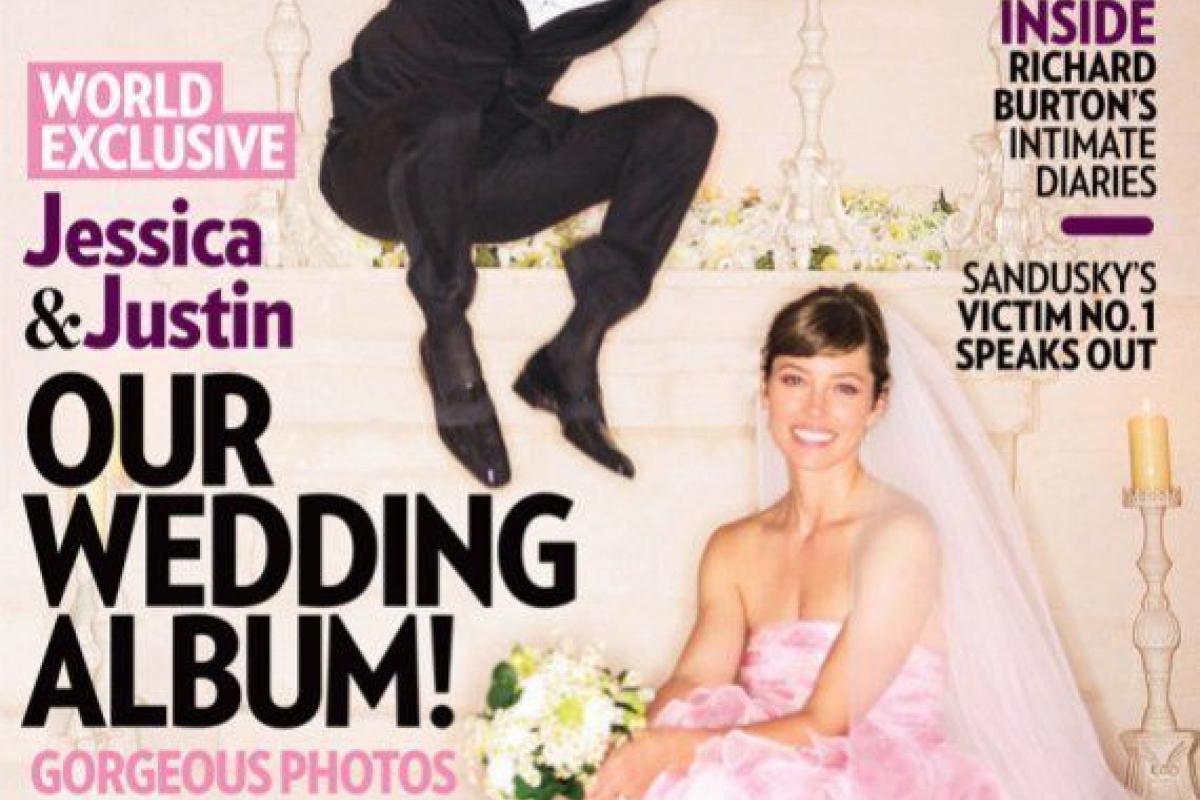 Las primeras fotos del enlace entre Biel y Timberlake están en manos de la revista People, que ha pagado 300.000 dólares por las imágenes que ilustran su portada del próximo viernes. En la portada de la revista aparece Biel en un vestido de novia de Giambattista Valli junto a Timberlake que salta vestido en un esmóquin de Tom Ford.