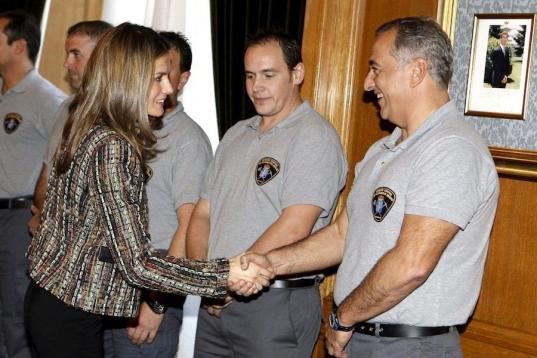 La princesa Letizia saluda a varios miembros de la Fundación CESPA (Centro Español de Solidaridad Principado de Asturias), a la que los Príncipes de Asturias han recibido en Audiencia en el hotel de la Reconquista.