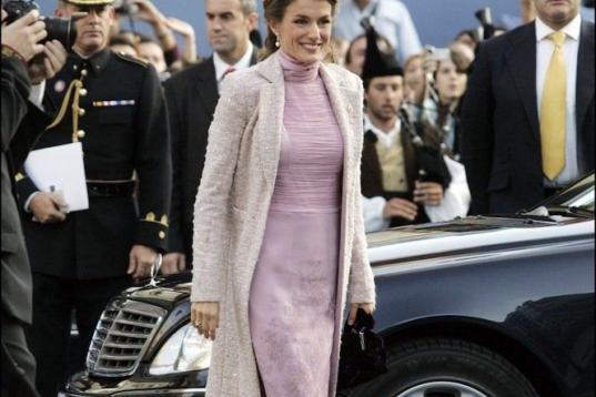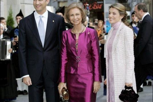 De Felipe Varela, en tonos lila, embarazada de la princesa Sofía.