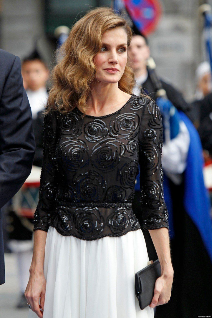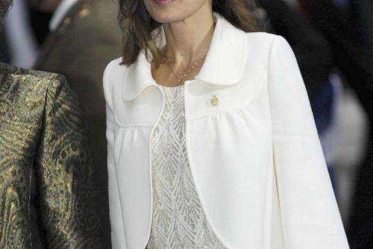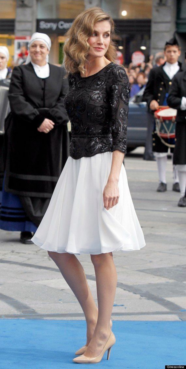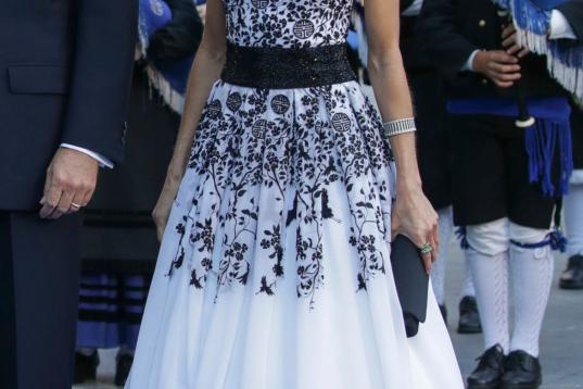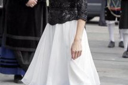 De tul blanco con bordados negros, zapatos de charol y carteras negras y con la pulsera de Cartier de la reina Victoria Eugenia.