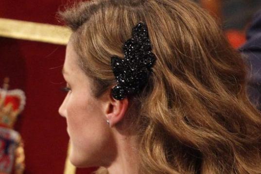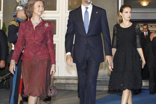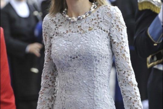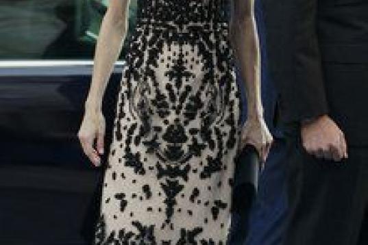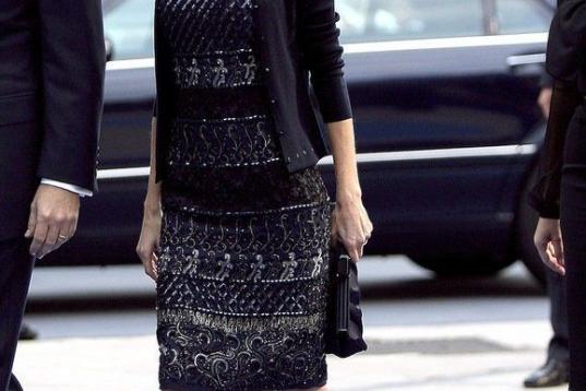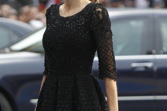 De Felipe Varela, con vestido de volantes en degradé de negro a gris, y zapatos de Magrit. Estrenaba por primera vez una joya de pasar, el collar de perlas de la reina Victoria Eugenia.