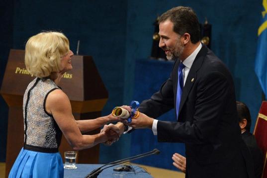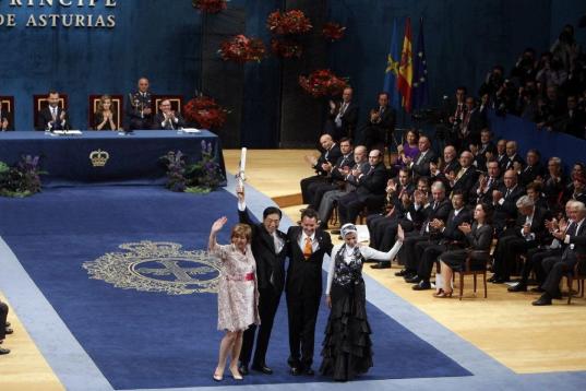 Los representantes del Movimiento Internacional de la Cruz Roja y de la Media Luna Roja Celia Fernández (i), Tadateru Konoé (2i), Peter Maurer (2d), Amal Eman (d), tras recoger el premio Príncipe de Asturias de Cooperación Internacional 201...