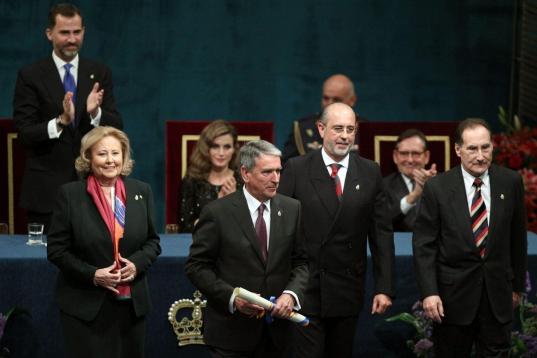 José Antonio Busto (2i), presidente de la Federación Española de Bancos de Alimentos, acompañado de otros representantes, tras recoger el premio Príncipe de Asturias de la Concordia 2012, de manos del príncipe Felipe.