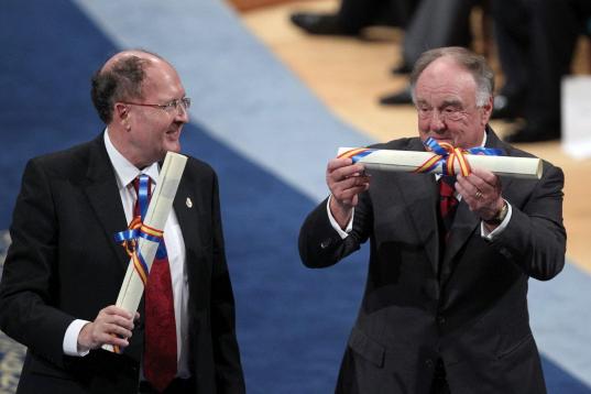 El biólogo británico Gregory Winter (i) y el patólogo estadounidense Richard Lerner, tras recoger el Premio Príncipe de Asturias de la Investigación Científica y Técnica.