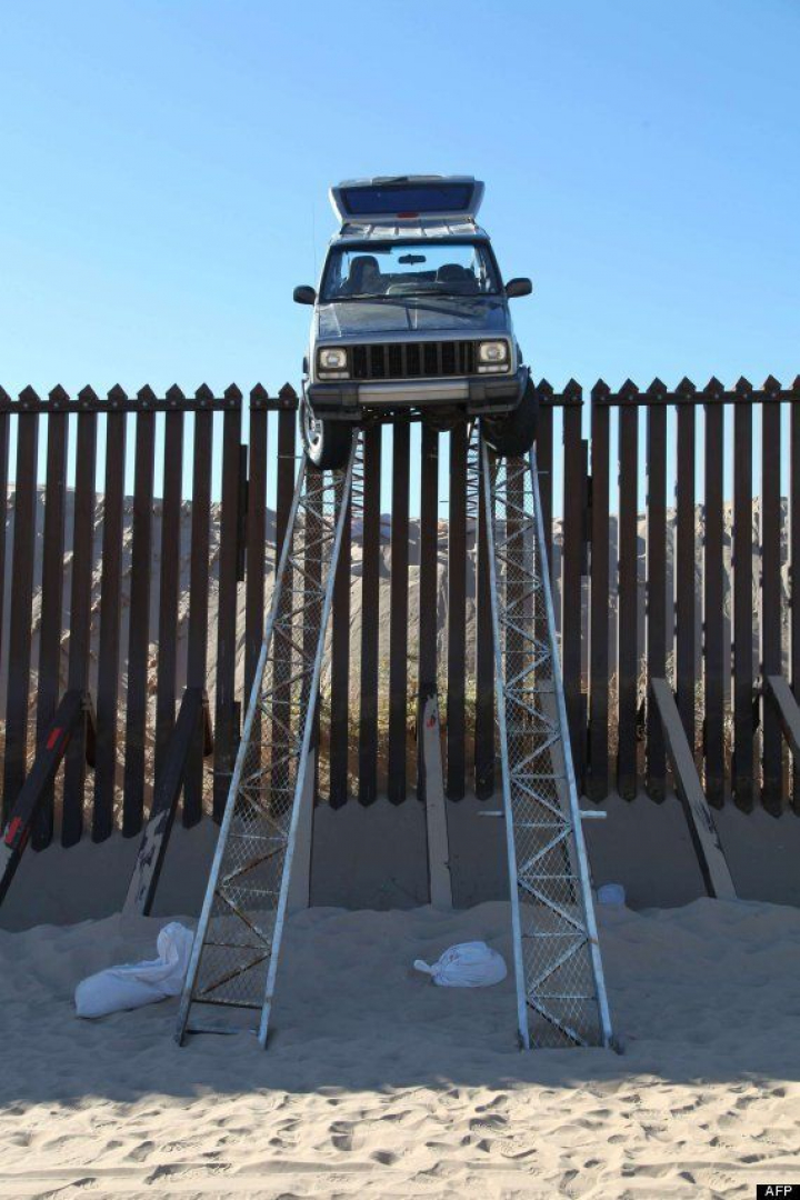 El vehículo, un Jeep Cherokee, estaba a unos cuatro metros del suelo sujetado por un par de rampas de metal cerca de Imperial Sand Dunes en el estado de California. Cuando la policía estadounidense lo descubrió, un par de hombres que intentaban bajar la camioneta se alejaron corriendo hacia México al ver a los agentes.