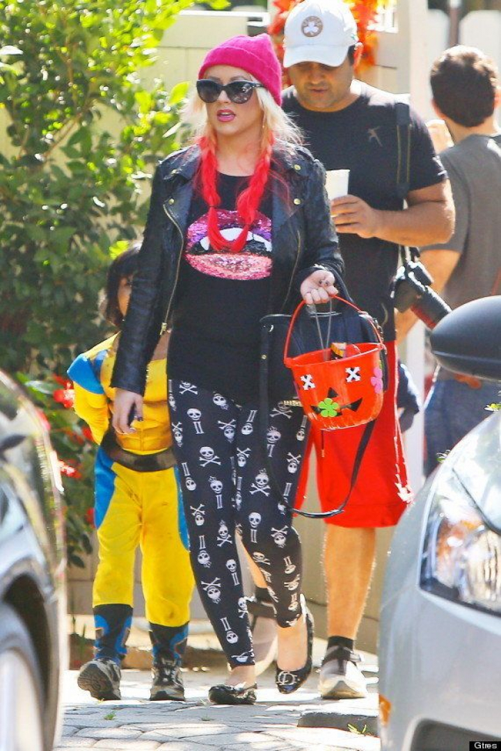 La cantante Christina Aguilera también pidió dulces de Halloween en las calles de Brentwood (California). Aunque no iba disfrazada, la cantante usó unos leggings con calaveras y una camiseta con una boca de vampiro.