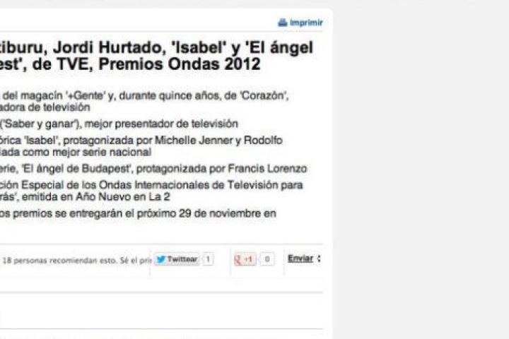 De hecho, en el portal de la "sala de comunicación" de RTVE en rtve.es se habla de que Televisión Española "ha sido multipremiada", sin indicar en cuántas ocasiones, pero no hay mención a los premios a RNE. Sí se da la información, destacando especialmente el premio a Carne Cruda, en la parte de información de rtve.es (con una de las fotos de la noticia para Javier Gallego, conductor y director del extinto programa), en una pieza titulada "Anne Igartiburu, Jordi Hurtado e 'Isabel', Premios Ondas 2012". La de "prensa" figura como publicada este jueves, a las 10.03 de la mañana, mientras que la informativa tiene fecha del miércoles, día 7.