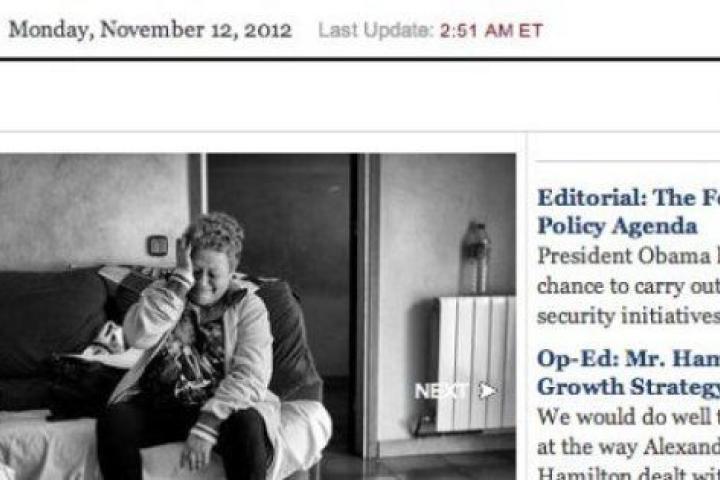 El artículo, titulado "Una oleada de desahucios conduce a una crisis de sin techo en España", está firmado por Suzanne Daley, y analiza el drama de las personas que son expulsadas de sus hogares por el impago de deudas. Lo acompaña una colección de 11 fotografías de Samuel Aranda, el laureado fotógrafo con el World Press Photo 2011 que en septiembre retrató el impacto de la austeridad.
