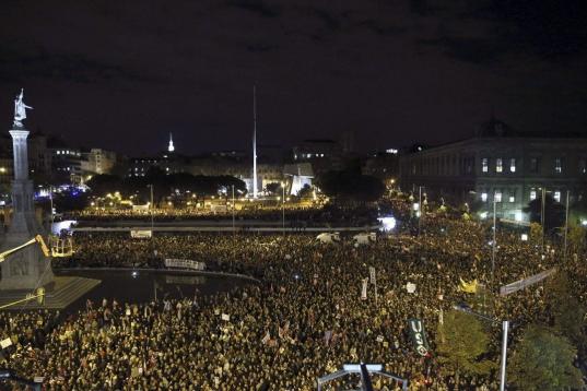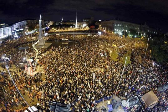 Gran número de personas en la plaza de Colón, donde ha finalizado la manifestación convocada por los sindicatos, que ha partido de la plaza de Cibeles de la capital.