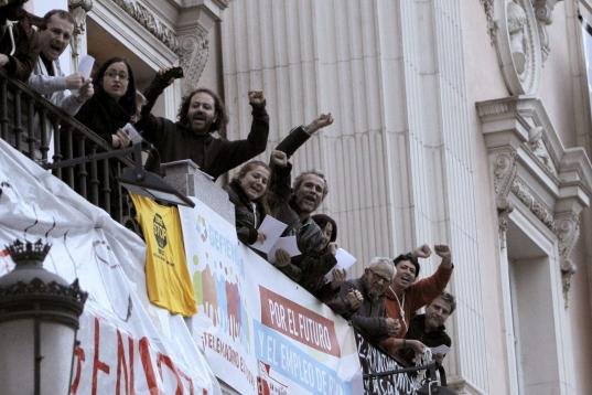 Una veintena de actores ha tomado desde las 22.15 horas de hoy, el Teatro Español y ha desplegado una pancarta desde la fachada que da a la plaza de Santa Ana en apoyo a la huelga general del 14N. El grupo de actores, entre los que se encuentra...
