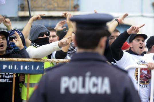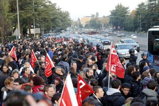 Agentes de la Policía Nacional intentan impedir que el Sindicato de Estudiantes corte la A-6, esta mañana durante la jornada de huelga general.